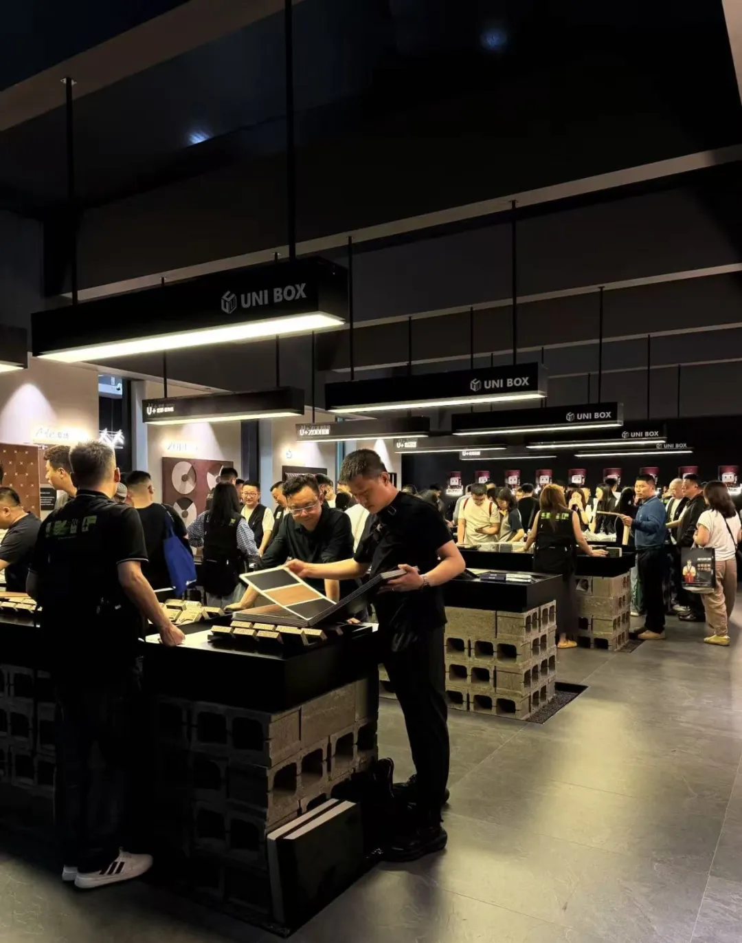 近千平方米的家的幕后主角好材料联展,围绕“品质、颜值、光影、自然”四个关键词,将材料特性与生活场景融合呈现,刷新材料价值的感知形式。饰面趋势舱汇聚装饰纸、PET膜、木皮、涂料、皮革等丰富饰面材料,同时引入家电、汽车、时尚领域的跨界材料,现场发布2027+家居美学CMF趋势及跨界应用。UNIBOX优盒联展集结10大品牌,用先锋设计打造沉浸式“盒子” 空间,把定制家居从原材料到艺术落地的全流程呈现。